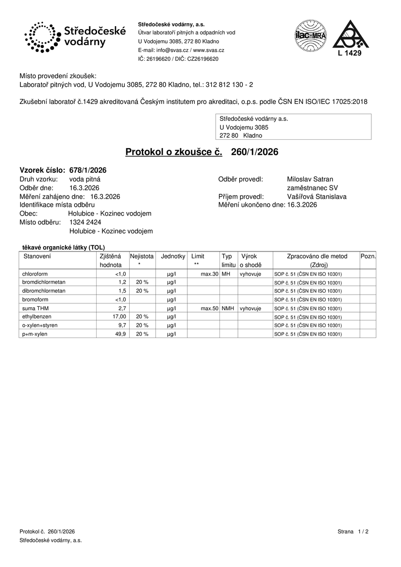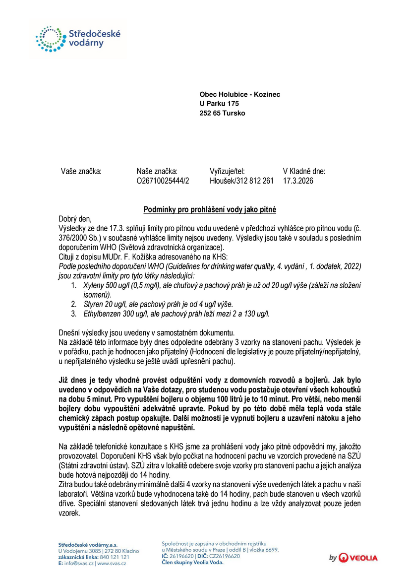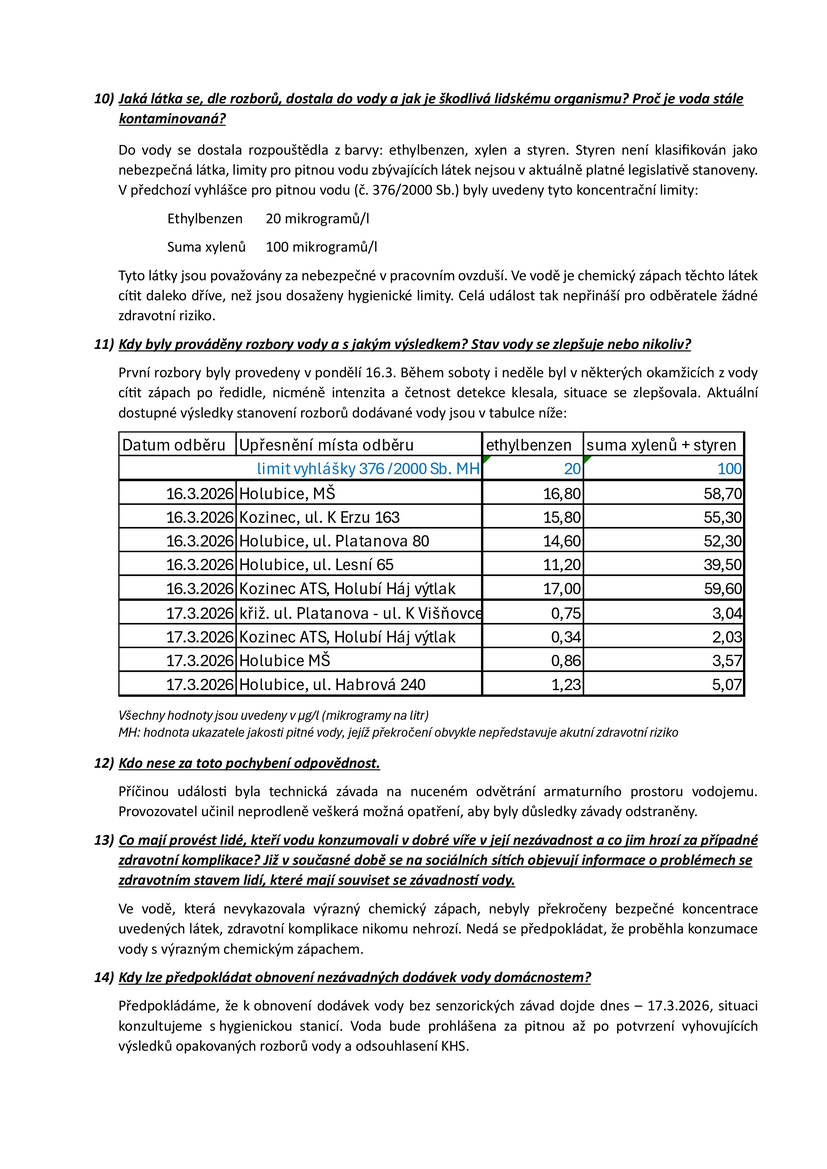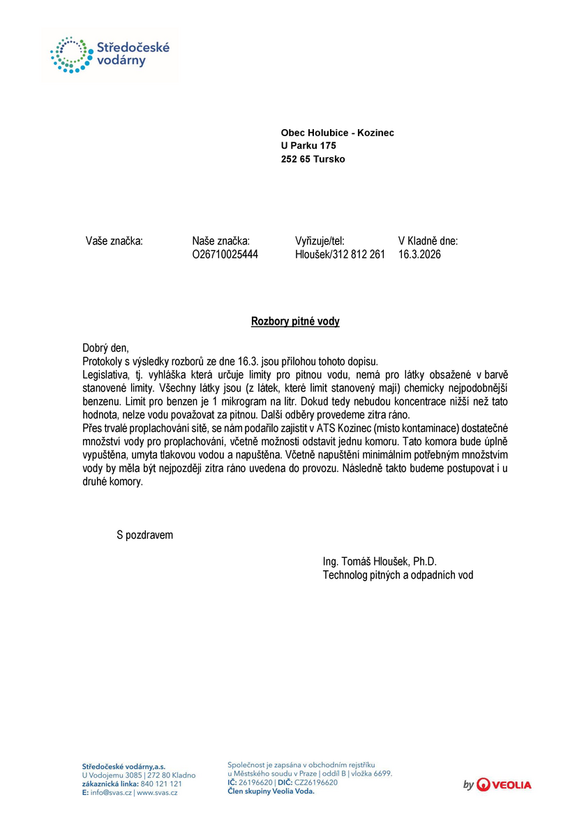 V pondělí budou odebrány vzorky vody k laboratorní analýze. Výsledky budou neprodleně zveřejněny.