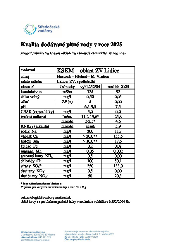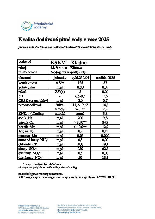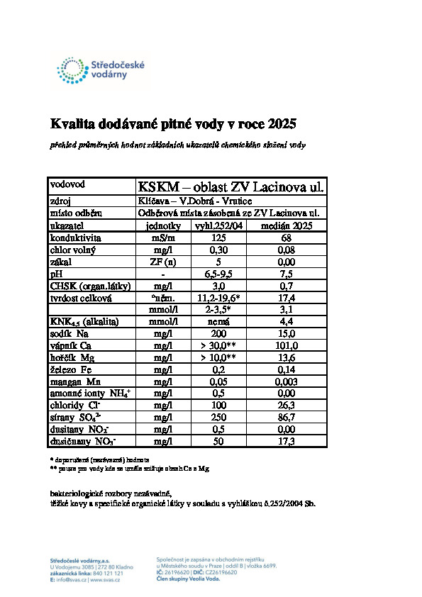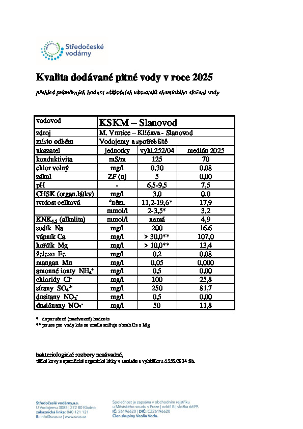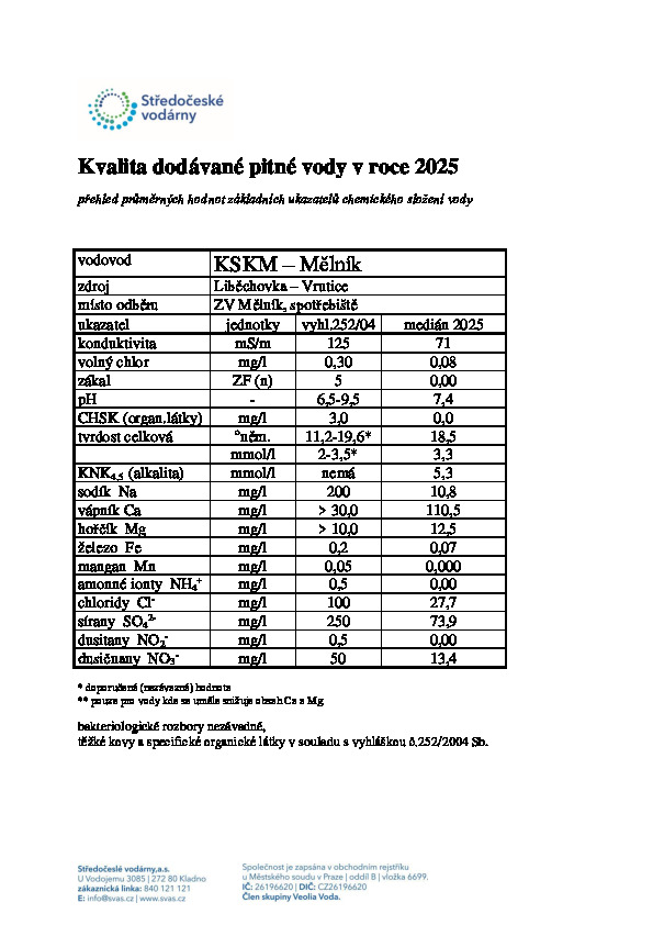 Úvod Vše o vodě Pitná voda Kvalita vody Kvalita vody - roční průměr za rok 2025